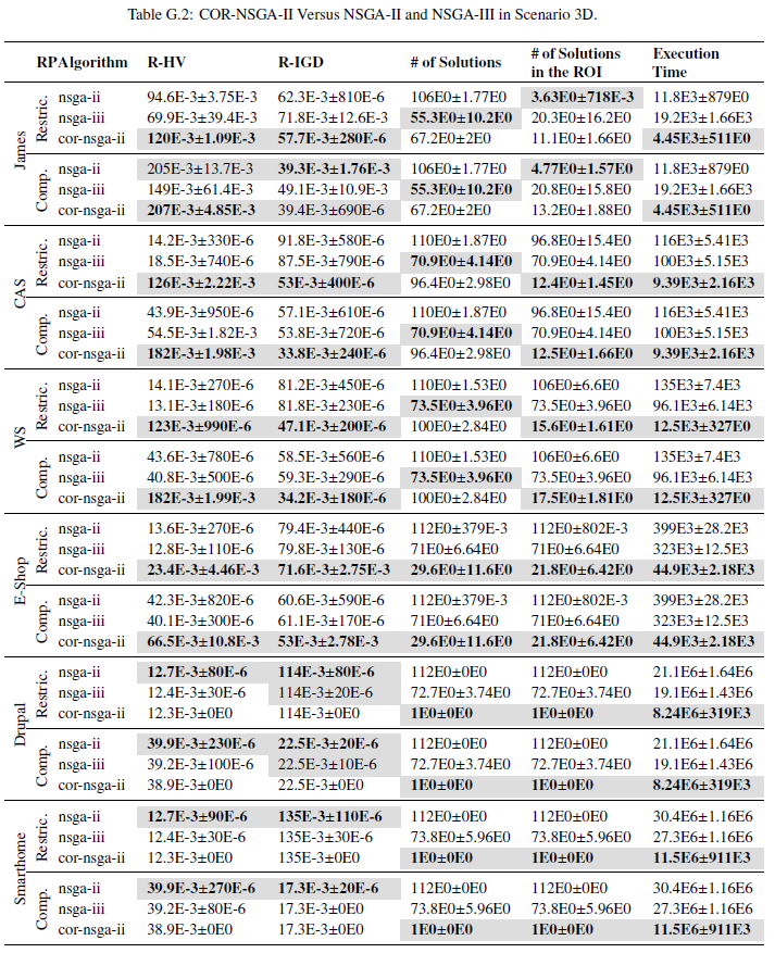 Results: COR-NSGA-II is evaluated against 4 algorithms explored in the literature for the problem, and outperforms most of them according to R-HV and R-IGD. It takes less time to execute and generates a reduced number of solutions, all of them satisfying the user preferences.